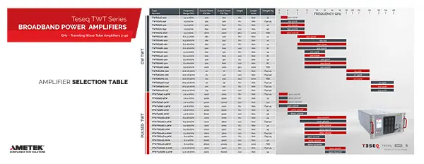 Gamme flexible de 10 KHz à 40 GHz. Puissance jusqu'à 11 kW (TWT pulsé) pour tous les standards (commercial, militaire, auto, aérospatial).