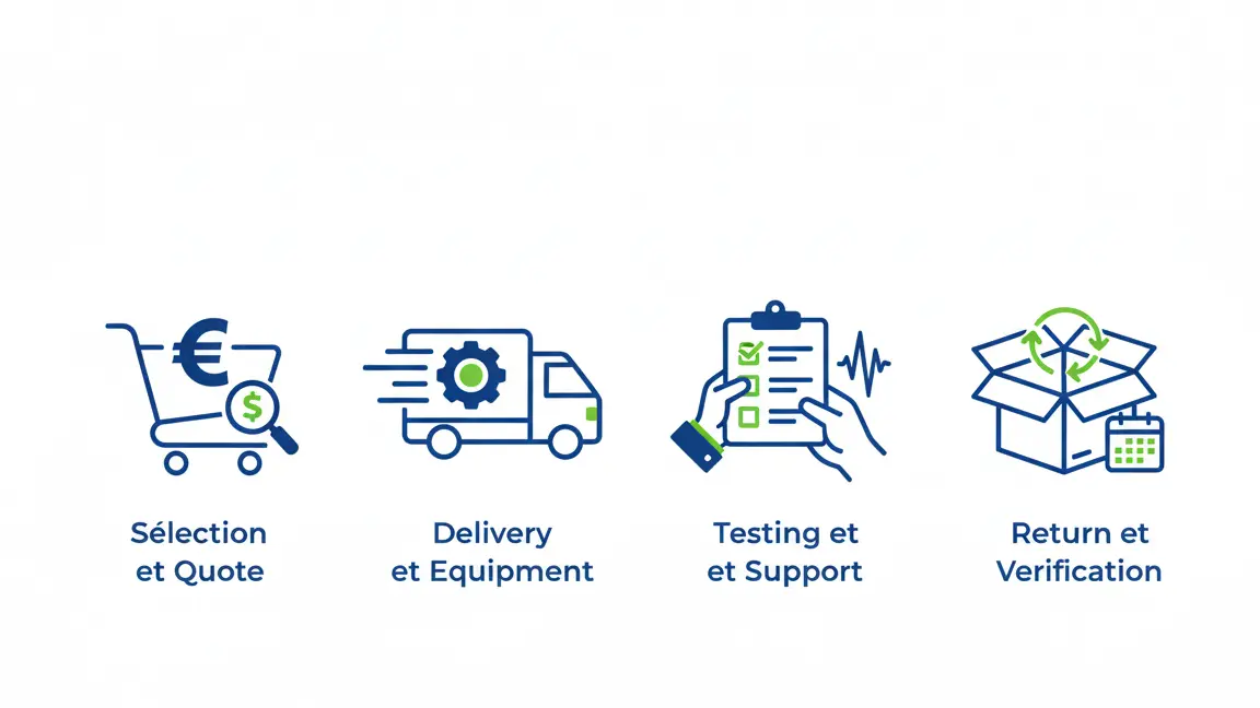 L'équipement est préparé, livré sur site, et le client l'utilise avec accès à un support technique si nécessaire.